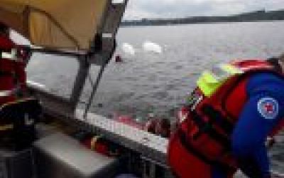 Im Anschluss segelte der Übungsleiter mit dem „Übungskatamaran“ ein gutes Stück hinter das echinger Bojenfeld, wo er ihn absichtlich zum kentern brachte. Die Wachmannschaft rüstete sich während der Anfahrt auf dem Motorrettungsboot aus und führte bei der Ankunft eine simulierte „Sofortrettung“ des verunglückten Seglers durch. Anschließend wurden verschiedene Techniken zum Aufstellen gekenterter Segelboote trainiert, was einen großen Kraftakt darstellt. Zum Abschluss der Übung wurde selbstverständlich auch das Schleppen geübt.