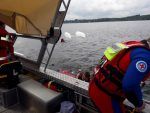 Im Anschluss segelte der Übungsleiter mit dem „Übungskatamaran“ ein gutes Stück hinter das echinger Bojenfeld, wo er ihn absichtlich zum kentern brachte. Die Wachmannschaft rüstete sich während der Anfahrt auf dem Motorrettungsboot aus und führte bei der Ankunft eine simulierte „Sofortrettung“ des verunglückten Seglers durch. Anschließend wurden verschiedene Techniken zum Aufstellen gekenterter Segelboote trainiert, was einen großen Kraftakt darstellt. Zum Abschluss der Übung wurde selbstverständlich auch das Schleppen geübt.